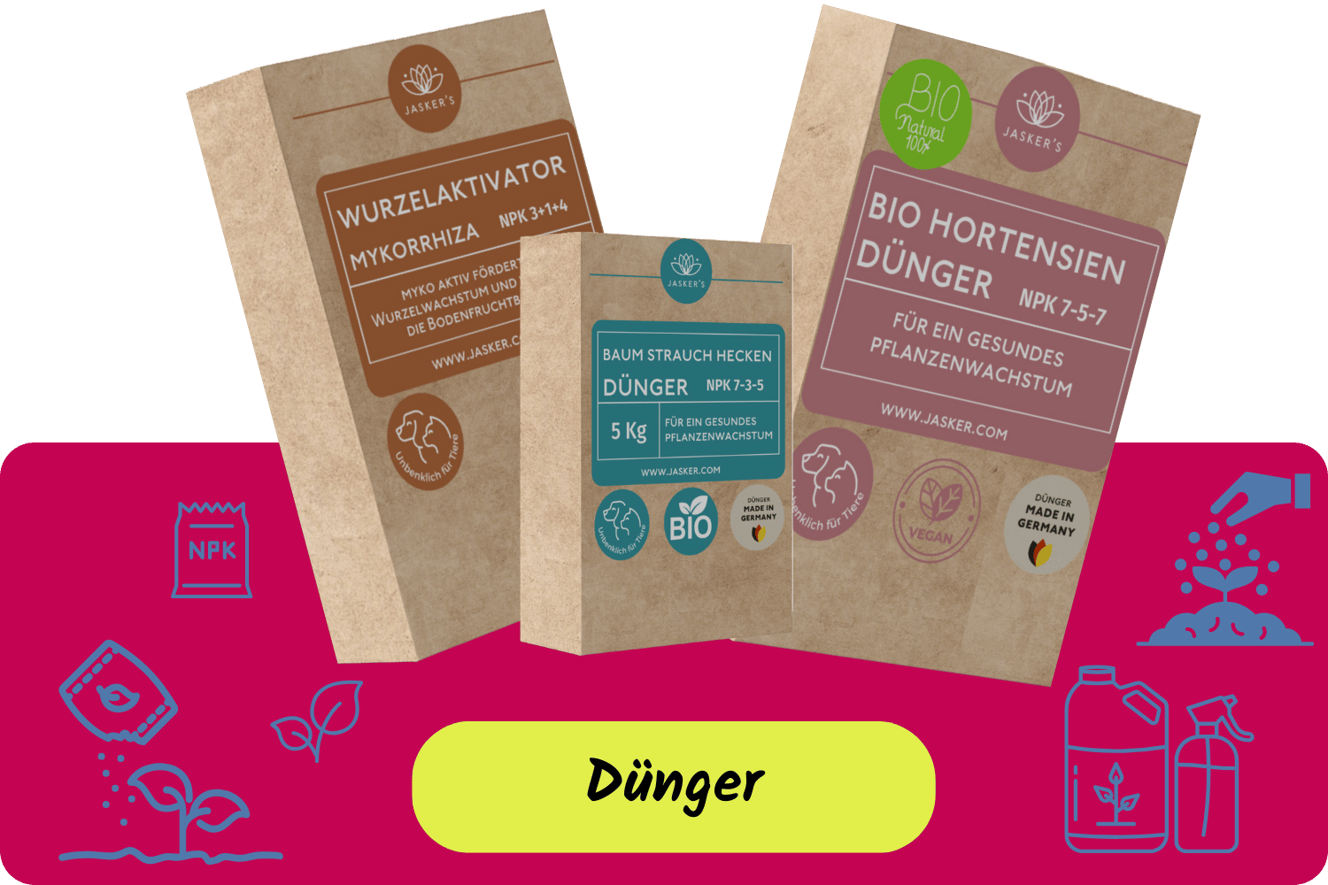 Bei uns bekommst Du Blumenerde & Dünger für deine Pflanzen. Unsere Eigenmarke ist bei Amazon und www.jasker.com erhältlich